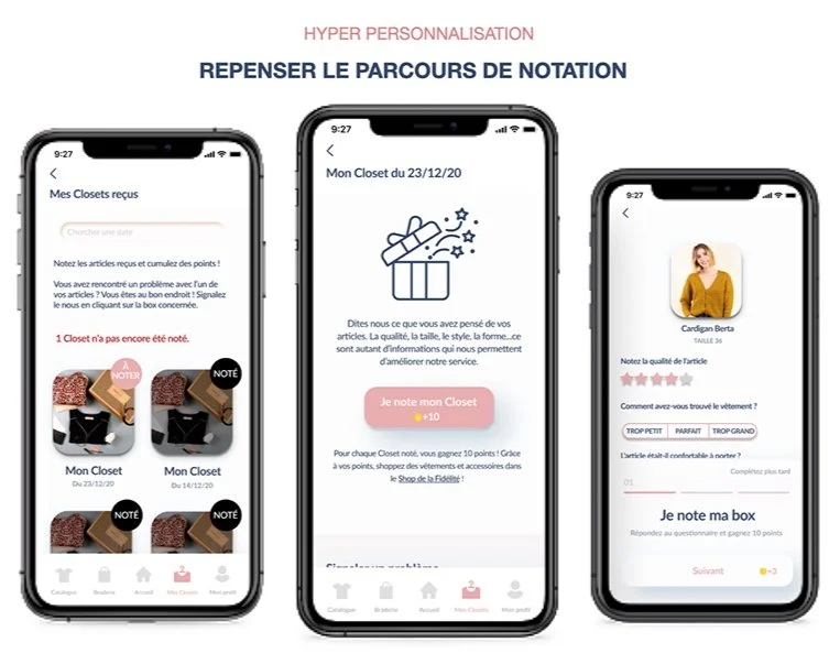 Enfin, pour "inciter" l'utilisatrice à répondre à ces questionnaires, nous avons repensé l'interface, qui est désormais plus user-friendly et accessible. Et nous avons mis en place un système de gamification qui vient récompenser l'utilisatrice qui note sa box : pour chaque questionnaire rempli, des points qui permettent d'acheter des articles dans le catalogue sont gagnés.